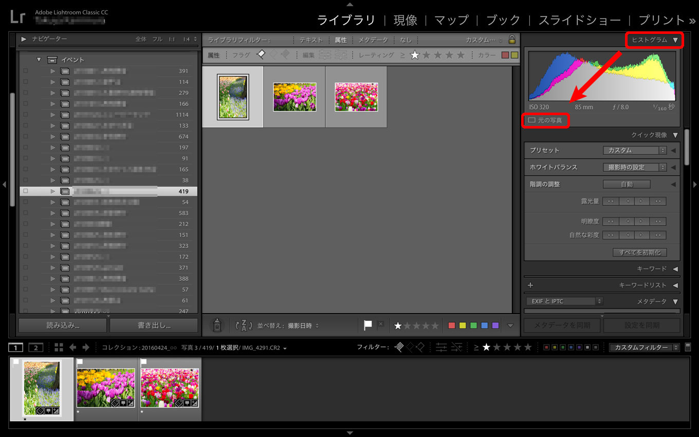 右のウィンドウにあるヒストグラムを広げ、下部にある「元の写真」をクリックします。