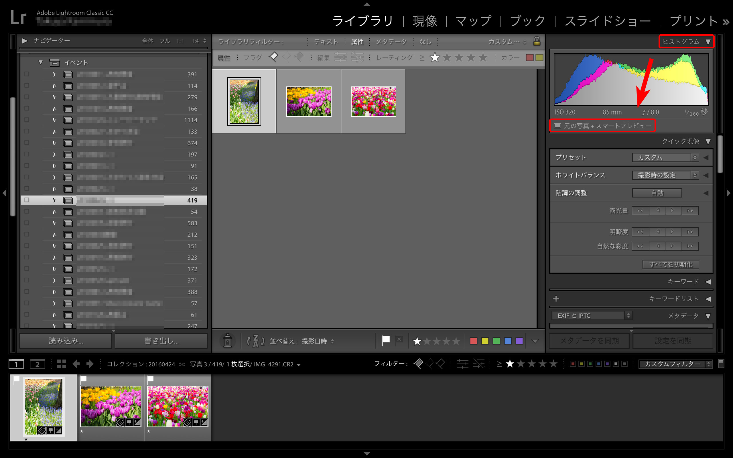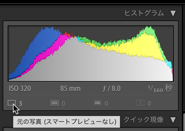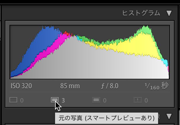 ヒストグラムの下部の表示が「元の写真 + スマートプレビュー」に変わります。