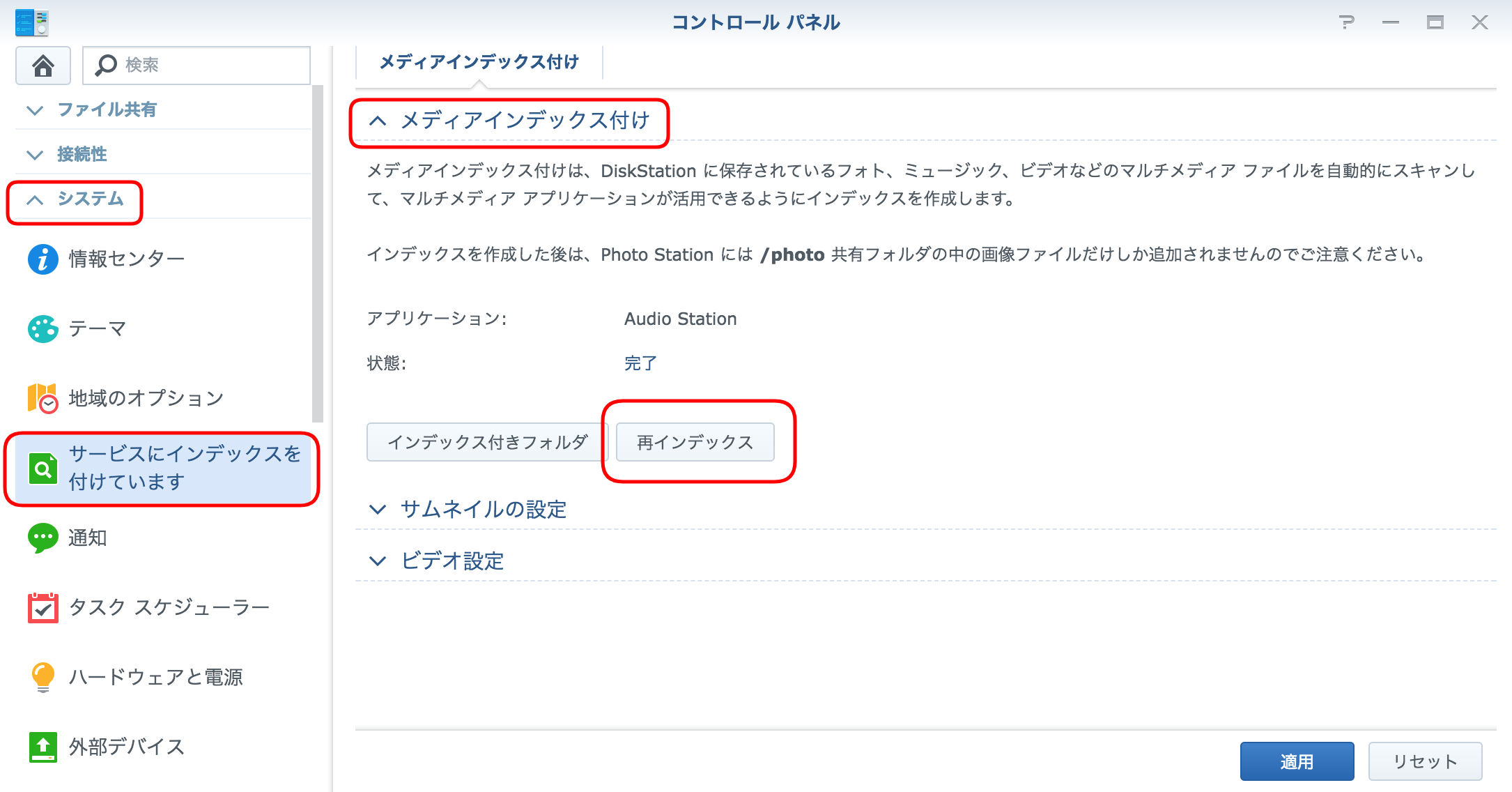 Audio Station の表示があると思いますので、その下の「再インデックス」ボタンをクリックします。 これでしばらく待つとアルバムアートワーク(カバー)が反映されます。